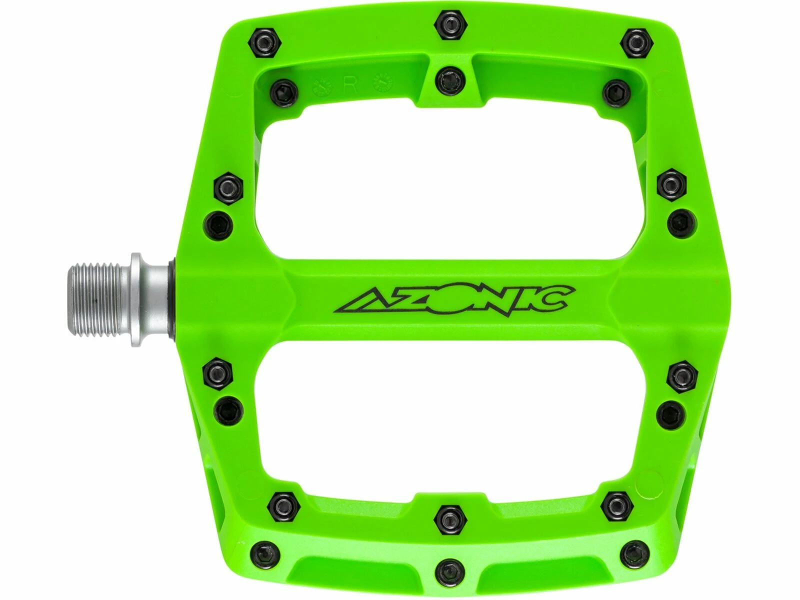 Die Azonic Blaze Pedale sind Flatpedals aus glasfaserverstärktem Nylon mit der hochwertigen Lagertechnik der CNC-Pedale, das heißt doppelt gedichtete Industrielager und DU Bushings. Mit 350 Gramm pro Paar sind die Blaze Pedale auch wirkliche Leichtgewichte.