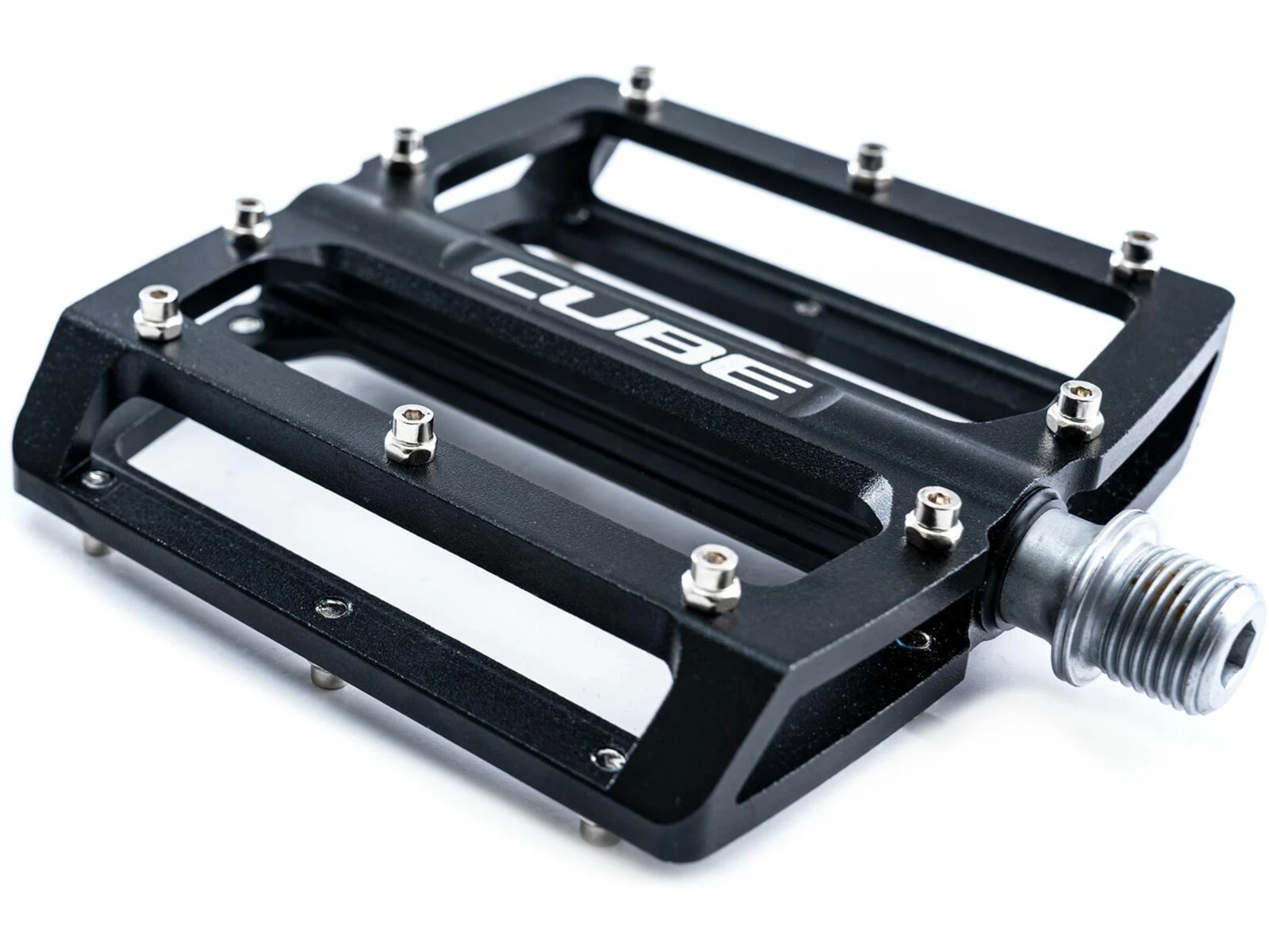 Die Cube Pedale All Mountain ist ein High-Performance-Flat-Pedal für progressive All-Mountain-Fahrer. Leichtgewichtig und mit niedrigem Profil dank CNC-Bearbeitung und konkavem Fußbett. Industrie- und Gleitlager sorgen auch bei holprigen Trails für Leichtlauf, die zehn austauschbaren Pins pro Seite garantieren den nötigen Halt.