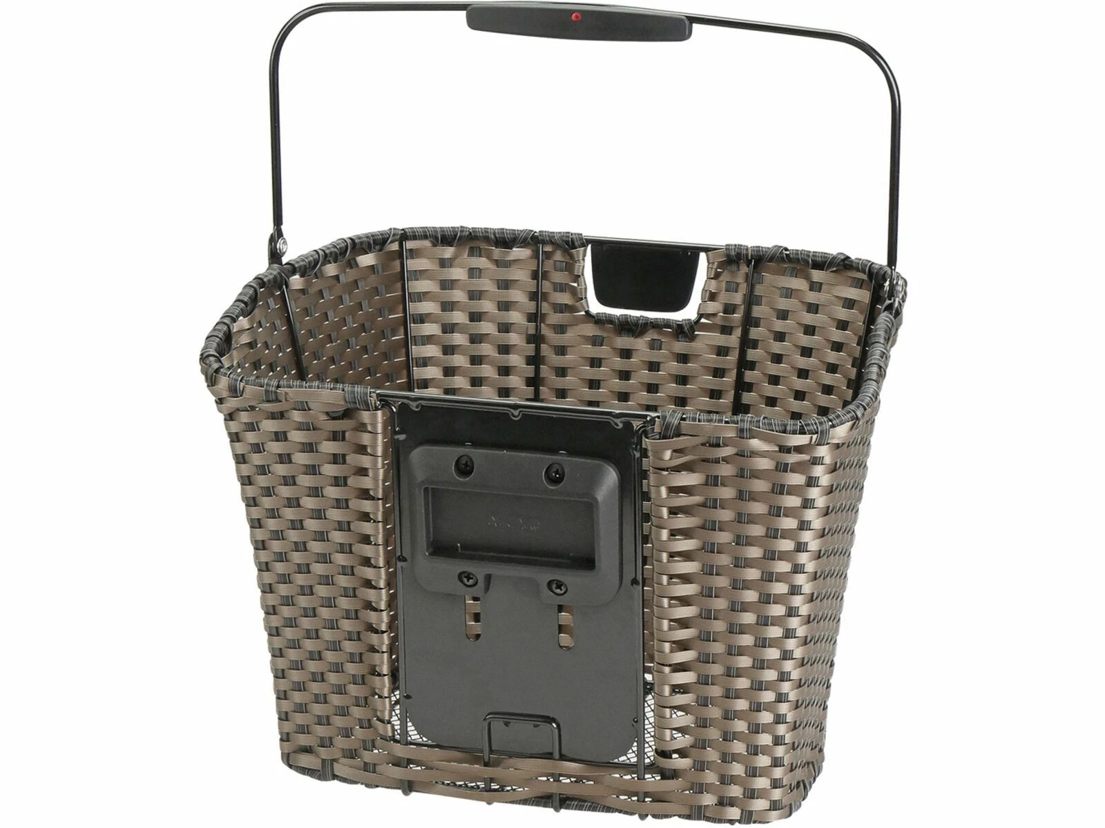 Einfach schön – die geflochtenen Lenkerkörbe ähneln optisch Naturfasern, sind dabei aber wetterfest und besonders farbbeständig. Mit Tragegriff und stufenlos höhenverstellbarer Adapterplatte für den Lenkeradapter. In vielen attraktiven Varianten. So macht das Einkaufen Spaß – einfach Taste drücken und mitnehmen.