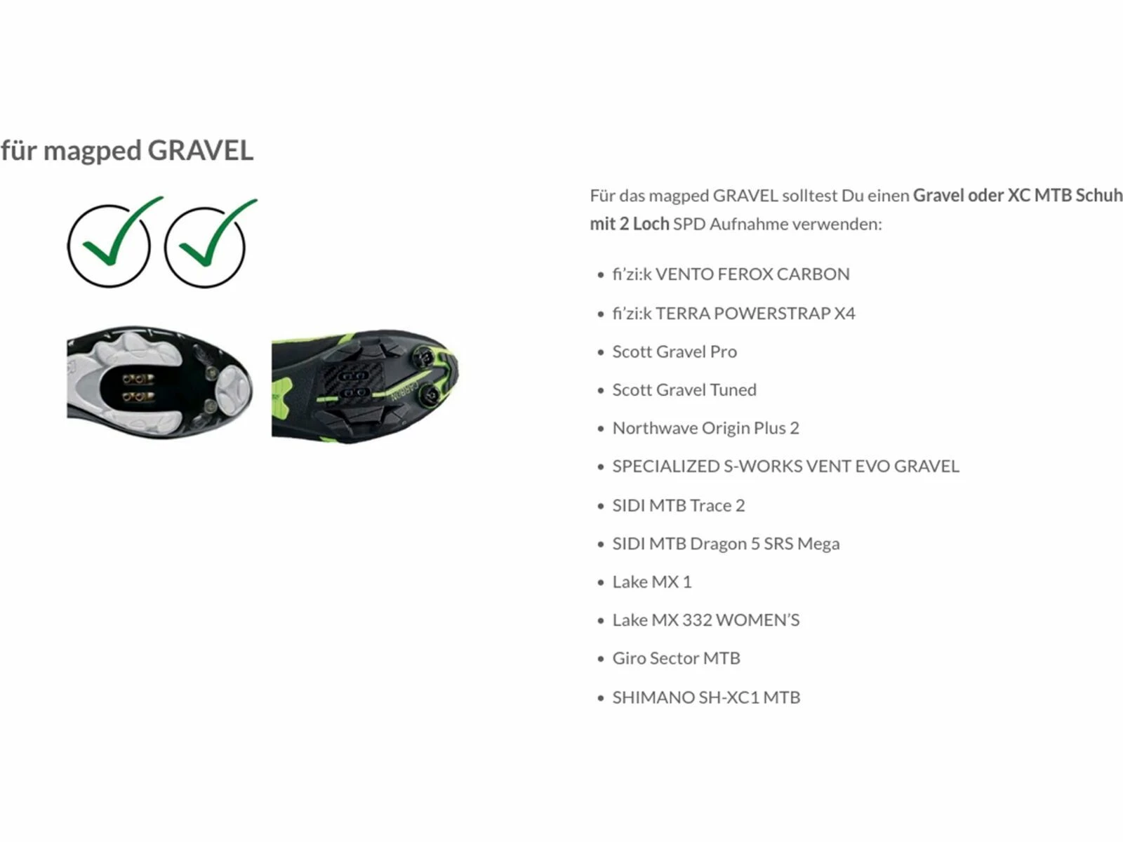 Hier mit 200 N Magnet für alle Gewichtsklassen ab ca. 45 kg. Für das Magped Gravel solltest du einen Gravel oder XC-MTB Schuh mit 2-Loch SPD-Aufnahme verwenden.