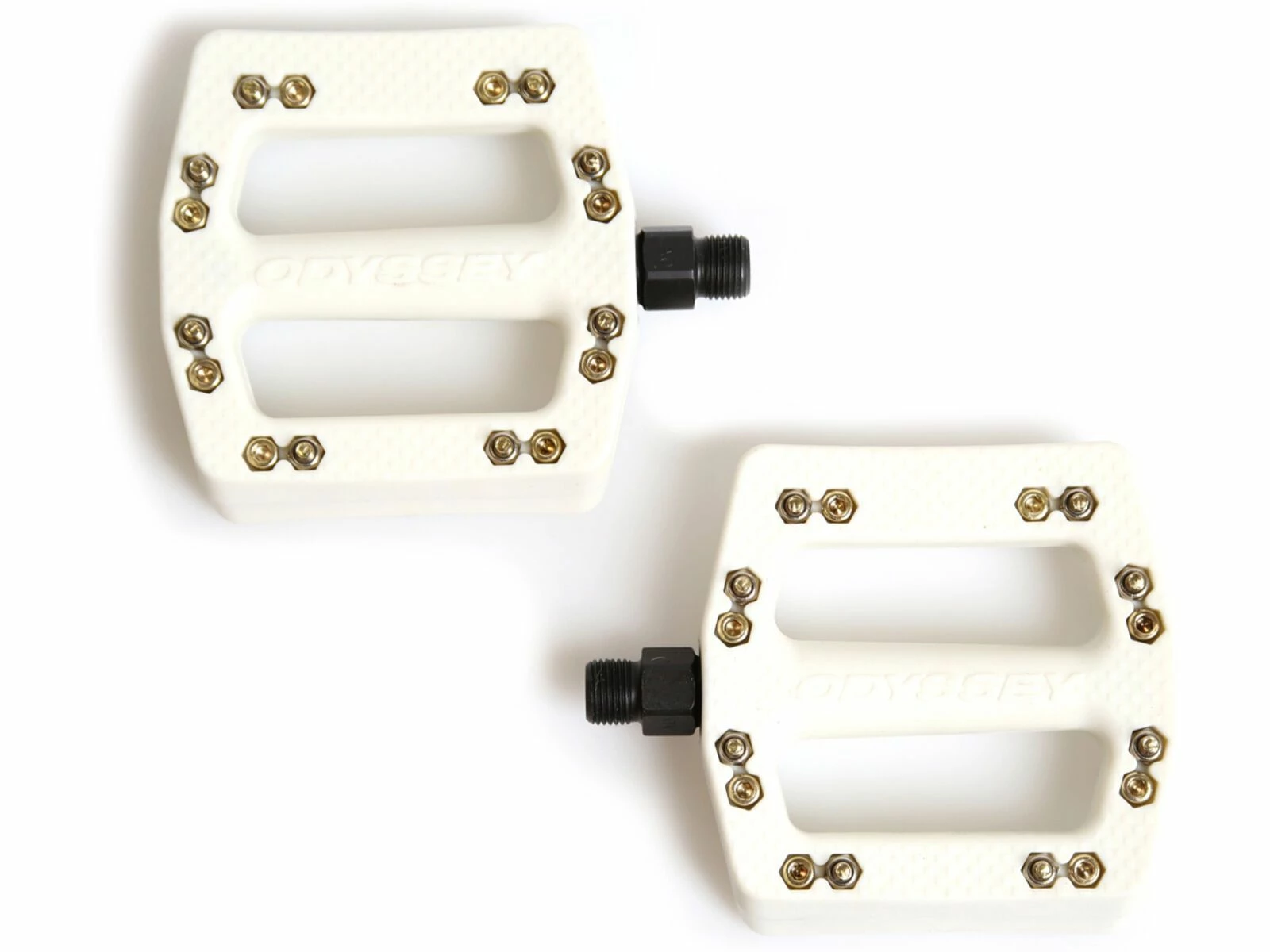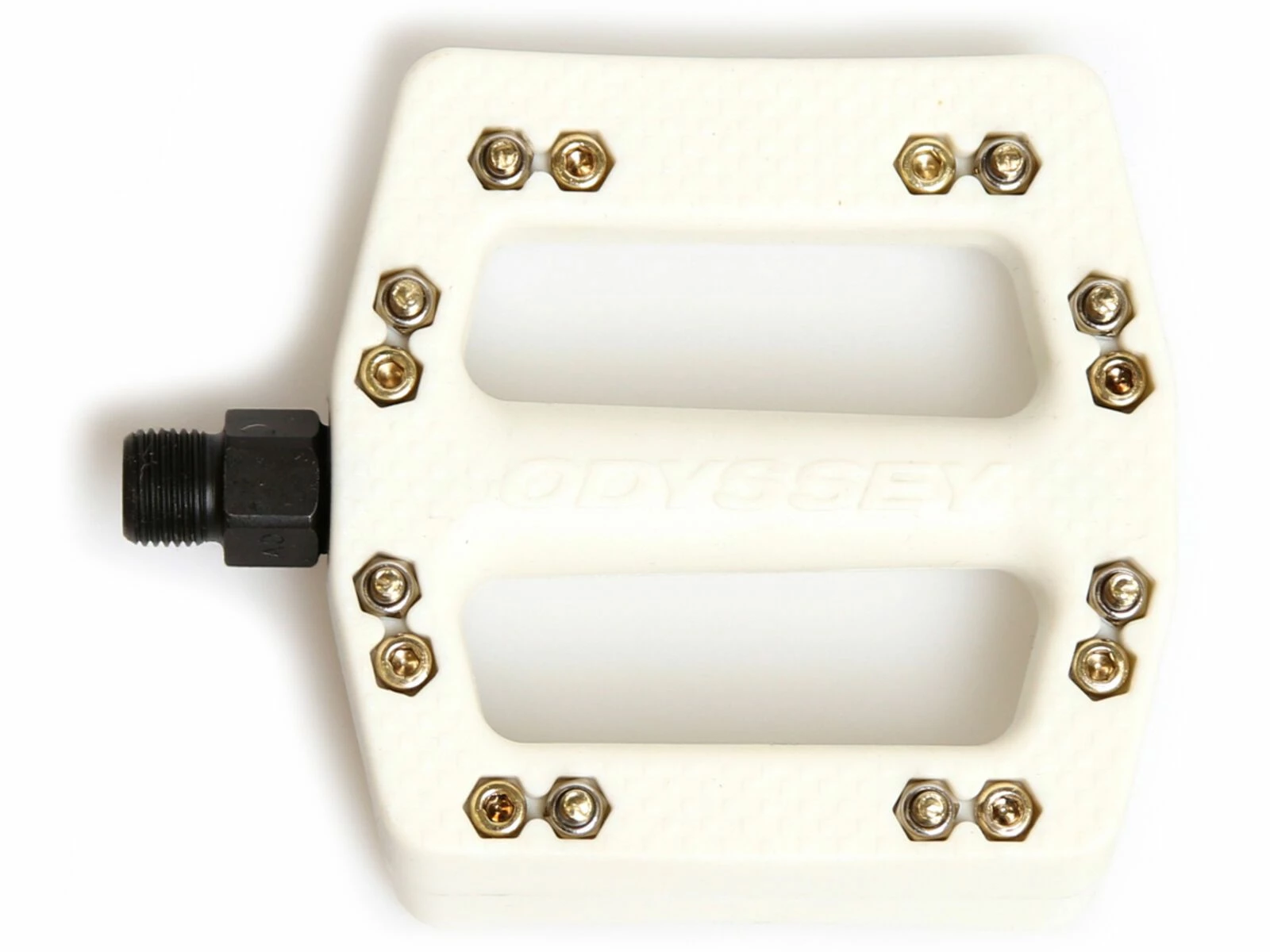 Die Odyssey OG PC-Pedale sind ein großer Sprung nach vorne in der Pedal-Technologie, was zu einem einfacheren Gesamtdesign führt. Extrem leichte Kunststoffpedalkörper ersparen die Lager und ermöglichen eine Achse, die deutlich stabiler als normal ist. Pedal Pins aus Stahl machen das Pedal sehr griffig, und das Pedal funktioniert auch dann noch normal, wenn die Pins für Grind Tricks von einer Seite entfernt werden. Keine hauchdünnen, außenliegenden Endkappen. Die Pedal-Kunststoffkörper sind einfach und kostengünstig austauschbar – anstatt das gesamte Pedal auszutauschen zu müssen.Material