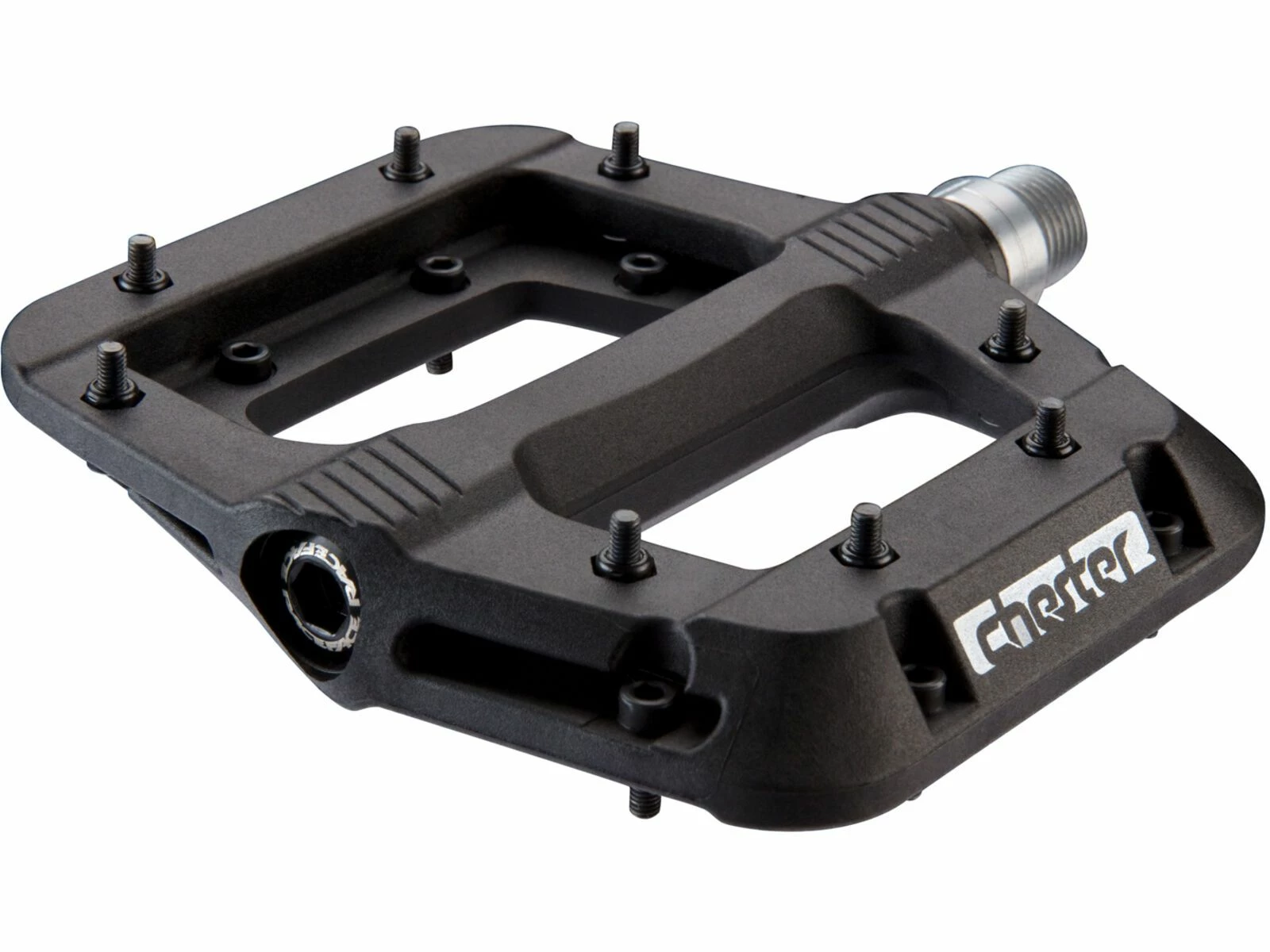 Das Chester Pedal erweitert Race Faces Line-Up flacher Plattform-Pedale. Der robuste und stämmige Nylon-Body bietet eine große Plattform mit acht Sechskantpins auf jeder Seite und somit den gleichen Grip wie traditionelle Pedale aus Metall. Das dünne und leichte Chester Pedal ist mit einer vollständig abgedichteten CroMo-Stahlachse und einem 100 % servicefähigem Lager ausgerüstet. Dieses Flatpedal bietet eine großartige Performance für eine Vielzahl von unterschiedlichen Fahrern und das zu einem umwerfendem Preis.