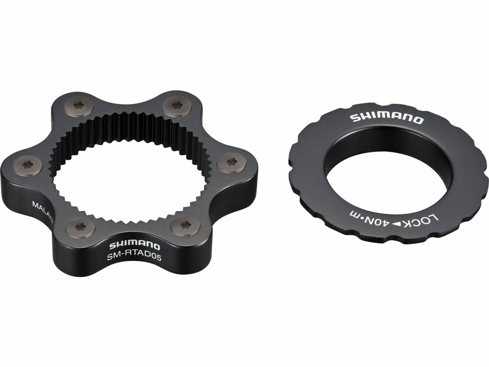 Adapter zur Befestigung einer 6-Loch Bremsscheibe auf eine Nabe mit Center-Lock Aufnahme. Verschlußring geriffelt.Herstellerinfo Shimano